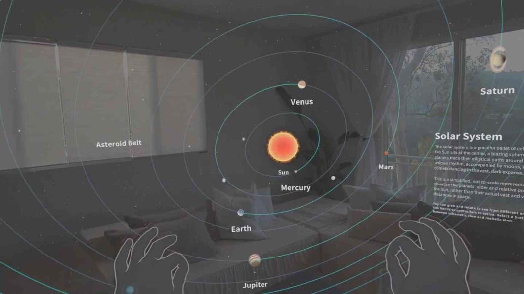 欢迎来到 Cosmic XR--您沉浸式的太空、宇宙及更广阔世界的大门,就在您的房间内.借助透视混合现实技术,您的环境将化身为一幅栩栩如生的宇宙地图.踏上一场充满星系、行星、卫星和黑洞的互动式太空探索之旅.