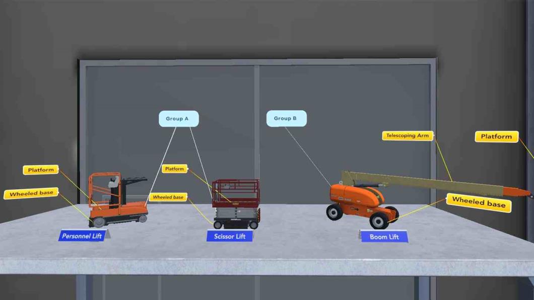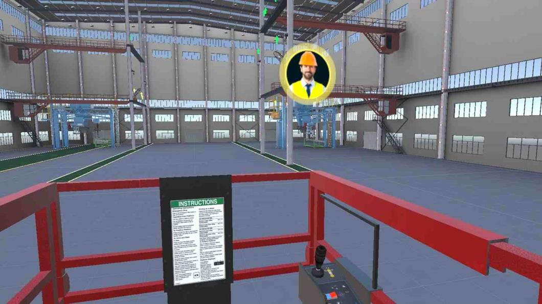 交互式操作模拟让参与者以安全逼真的形式探索、学习和练习安全操作剪叉式升降机.开始工作前,参与者必须穿戴个人防护装备 (PPE),并对升降机进行彻底的巡检.之后,他们必须穿过仓库,收集工作物品,并在 25 至 45 英尺(约 7.6 至 14.6 米)的高空进行维修.